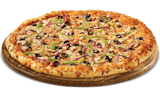 Pepperoni, sausage, ham, ground beef, onions, mushrooms, green peppers and black olives.